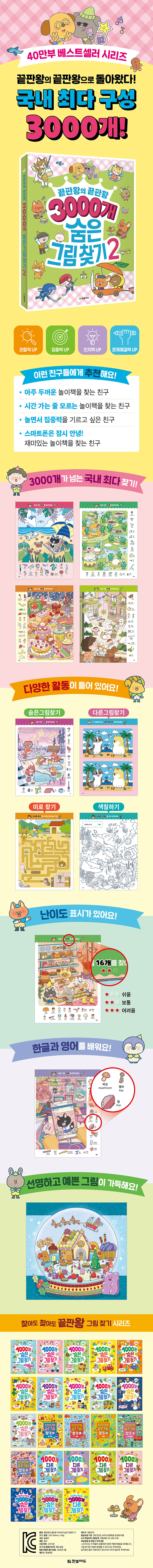 『끝판왕의 끝판왕 3000개 숨은그림찾기 2』와 함께하세요. 신나는 숨은그림찾기가 무려 3,000개! 아쉬움 없이 넉넉한 분량으로 시간 가는 줄 모르고 즐길 수 있어요. 아이 혼자 놀아도 좋고, 가족과 친구와 머리 맞대고 놀기에도 좋은, 아주 재미있는 책입니다. 숨은그림찾기는 두뇌의 고른 발달에 도움이 되는 활동입니다. 하나하나 집중해서 찾다 보면 어느새 관찰력과 집중력이 저절로 자라나 있을 거예요.