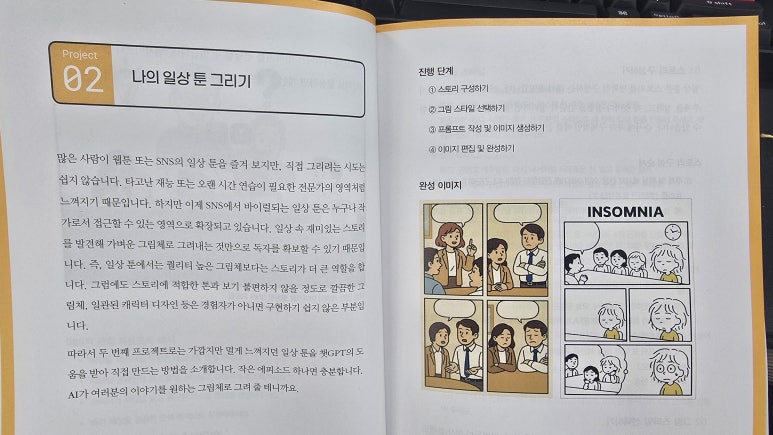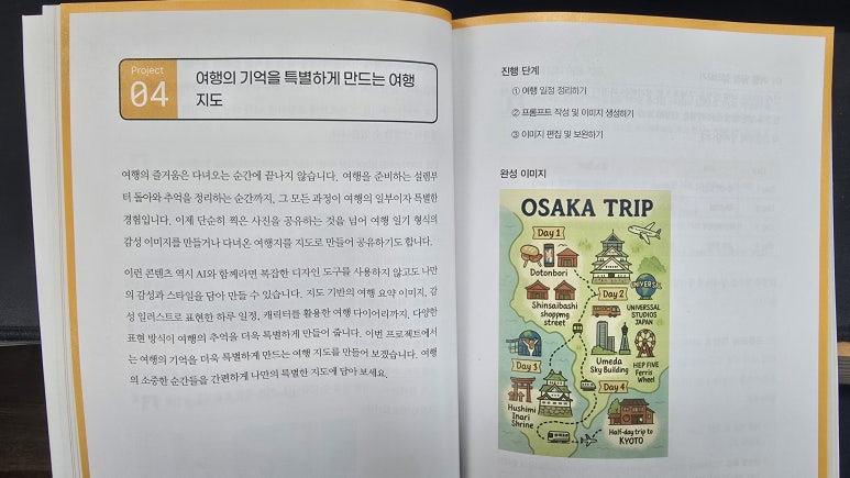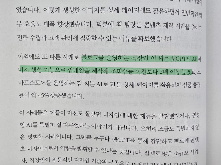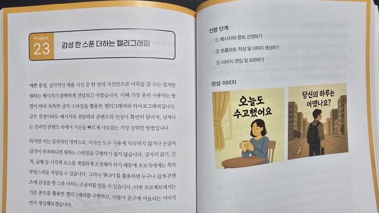 책을 읽으면서 나는 단순히 챗GPT를 '대답해주는 도구'로만 보던 시각에서 벗어나, '창작의 파트너'로서 바라보는 관점을 얻었다. 실제로 책 속 프로젝트를 따라 하면서, 아이디어를 구체화하는 과정이 이전보다 훨씬 빨라졌고, 디자인 작업에서 시행착오가 줄어들었다. 단순히 이미지를 얻는 것을 넘어, 콘셉트를 잡고 방향성을 정리하는 단계에서부터 AI를 함께 활용할 수 있다는 사실을 깨달은 것이다. 이는 앞으로 내가 콘텐츠 제작을 할 때 매우 큰 자산이 될 것 같다.