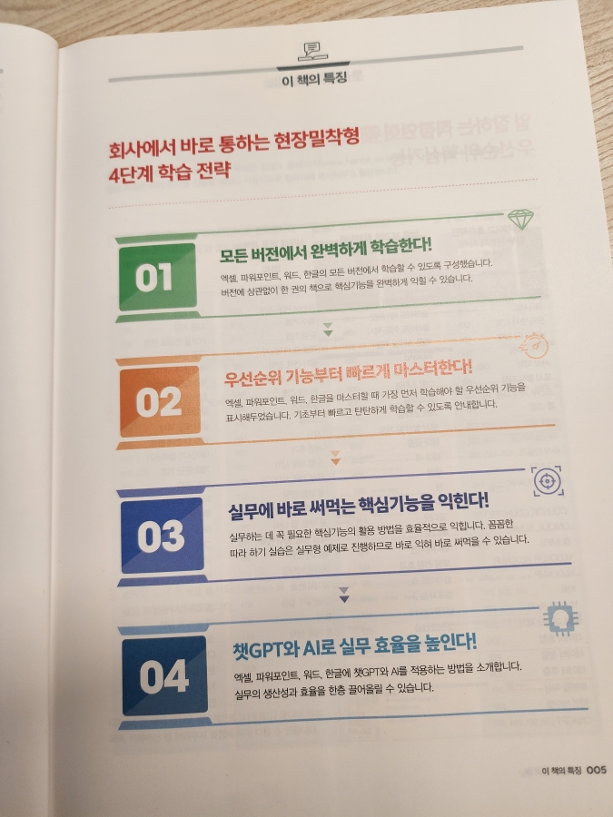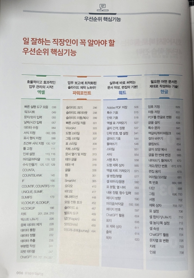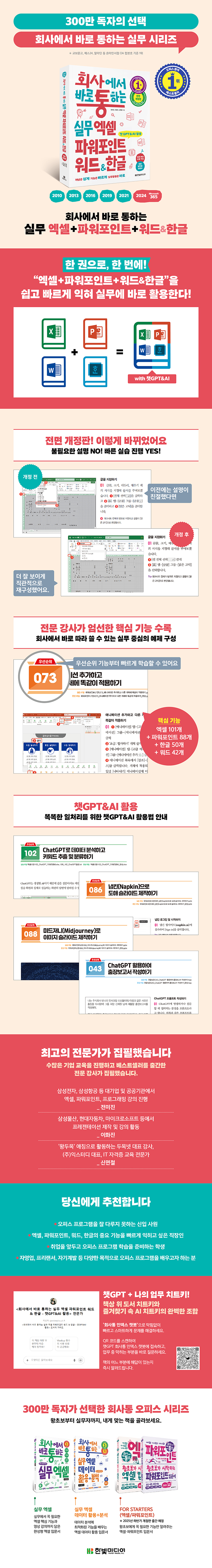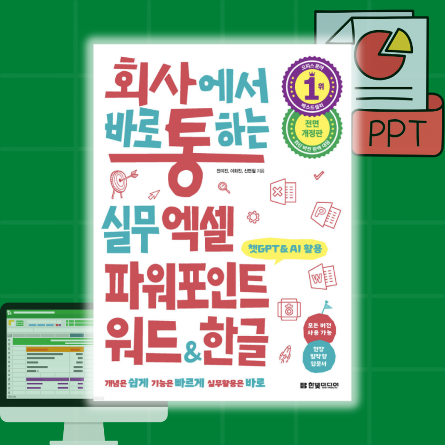 엑셀로 효율적인 업무 관리를, 파워포인트로 청중을 사로잡는 발표 노하우를, 워드와 한글에서는 실무에서 바로 써먹는 문서 작성 및 편집 기술을 익혀 탄탄한 실무 경쟁력을 쌓을 수 있다. 특히 이번 개정판에서는 챗GPT와 AI를 활용한 오피스 업무 자동화와 문서 작성 팁도 함께 수록해, 업무 생산성을 높이는 실질적인 방법까지 배울 수 있다.