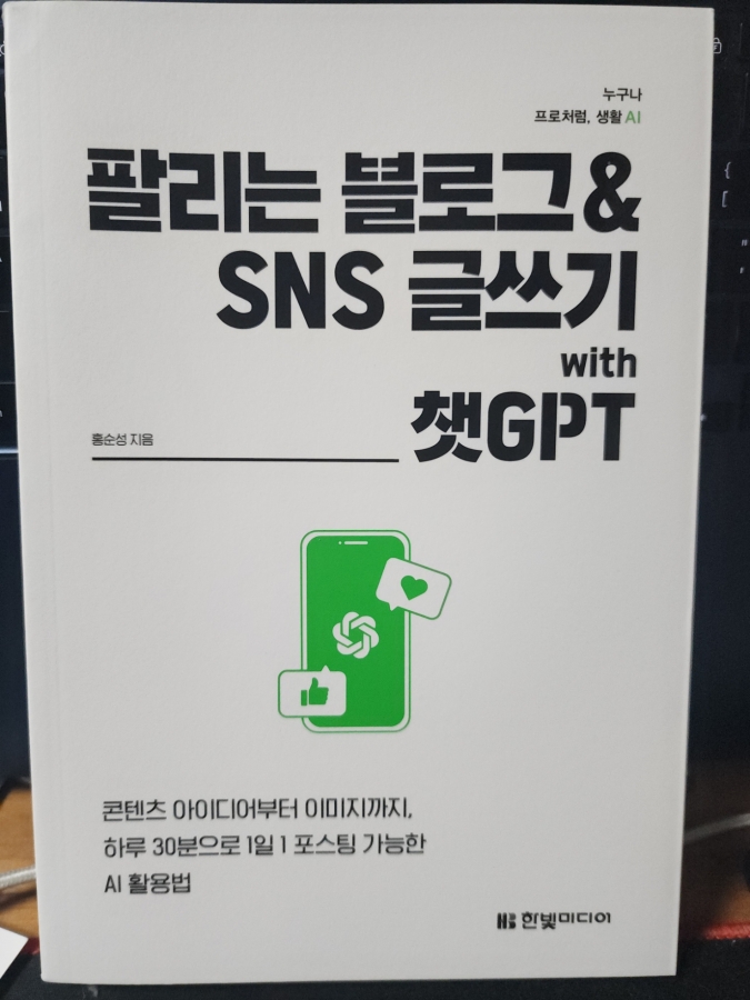 이 책은 홍순성 작가가 집필하고 한빛미디어에서 출간한 실용서로, 블로그와 SNS에서 ‘읽히는 글’을 넘어 실제로 ‘팔리는 글’을 쓰는 방법을 알려줍니다. 특히 챗GPT 하나로 콘텐츠 아이디어 발굴부터 글 작성, 이미지 제작까지 한 번에 해결할 수 있도록 구성되어 있어요. 글쓰기가 막막한 사람들에게는 든든한 가이드가 되어줄 책이라는 인상을 받았습니다.
