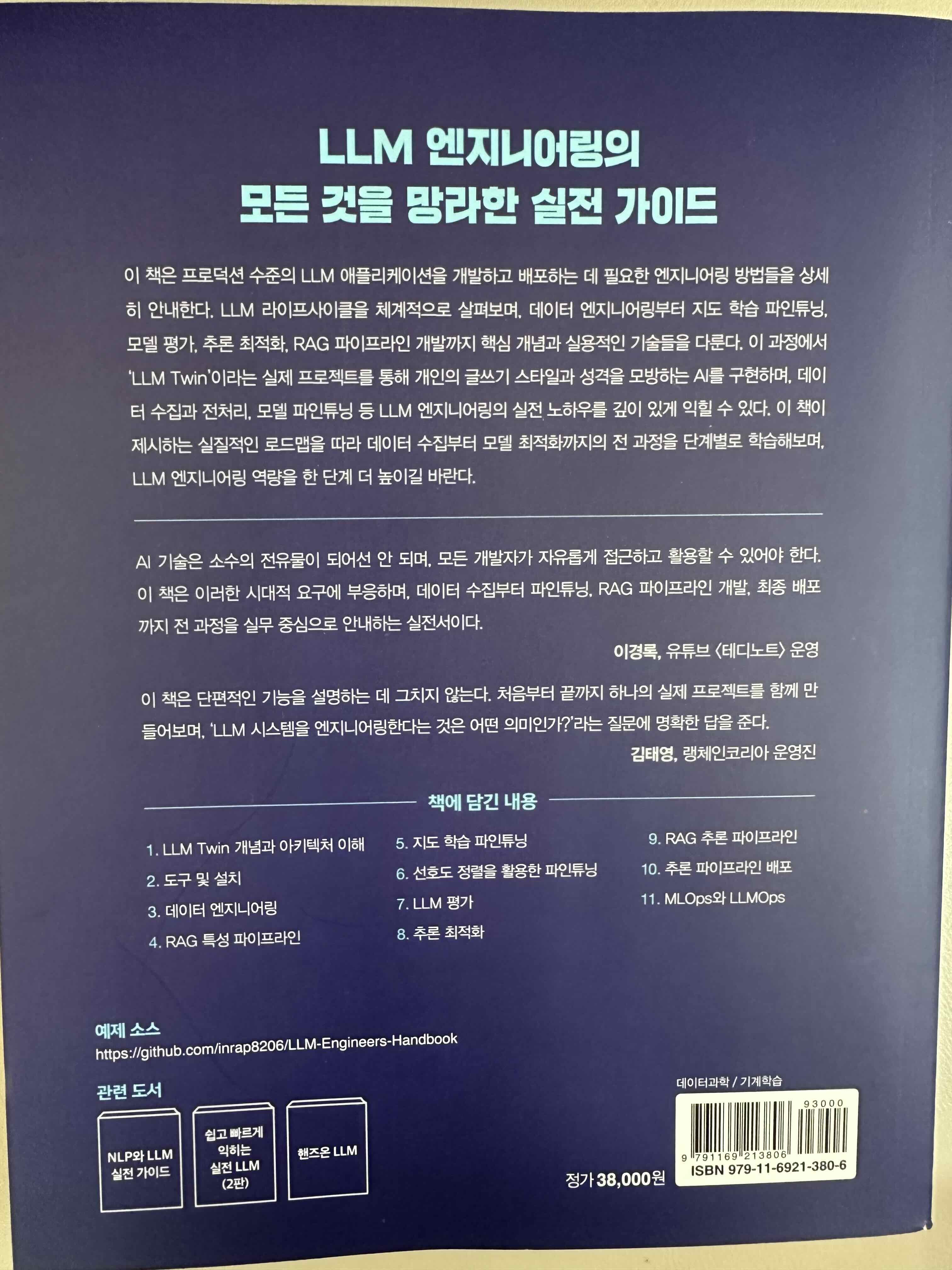 이 책은 프로덕션 수준의 LLM 애플리케이션을 개발하고 배포하는 데 필요한 엔지니어링 방법들을 상세히 안내한다. LLM 라이프사이클을 체계적으로 살펴보며, 데이터 엔지니어링부터 지도 학습 파인튜닝, 모델 평가, 추론 최적화, RAG 파이프라인 개발까지 핵심 개념과 실용적인 기술들을 다룬다. 이 과정에서 ‘LLM Twin’이라는 실제 프로젝트를 통해 개인의 글쓰기 스타일과 성격을 모방하는 AI를 구현하며, 데이터 수집과 전처리, 모델 파인튜닝 등 LLM 엔지니어링의 실전 노하우를 깊이 있게 익힐 수 있다. 이 책이 제시하는 실질적인 로드맵을 따라 데이터 수집부터 모델 최적화까지의 전 과정을 단계별로 학습해보며, LLM 엔지니어링 역량을 한 단계 더 높이길 바란다.