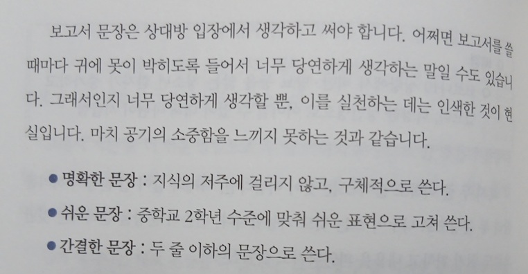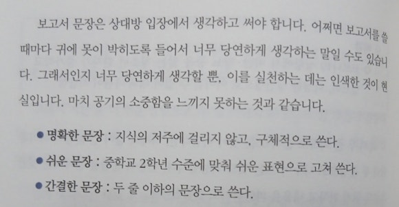 이는 비단 어딘가에 소속되어 있는 조직구성원, 직장인에게만 한정된 이야기는 아닐 것이다. 딱딱한 형식의 글과 문서가 아니더라도 자영업자든 프리랜서든 중소기업이나 대기업이든 우리는 크고 작은 보고와 소통을 주고 받는다. 결국 이러한 기본을 익히고 마주하려고 하지 않는다면 아무리 회사에서 연차가 오래되거나 업력이 오래되었더라도 제대로 된 소통을 하지 못하고 있을 확률이 높다.