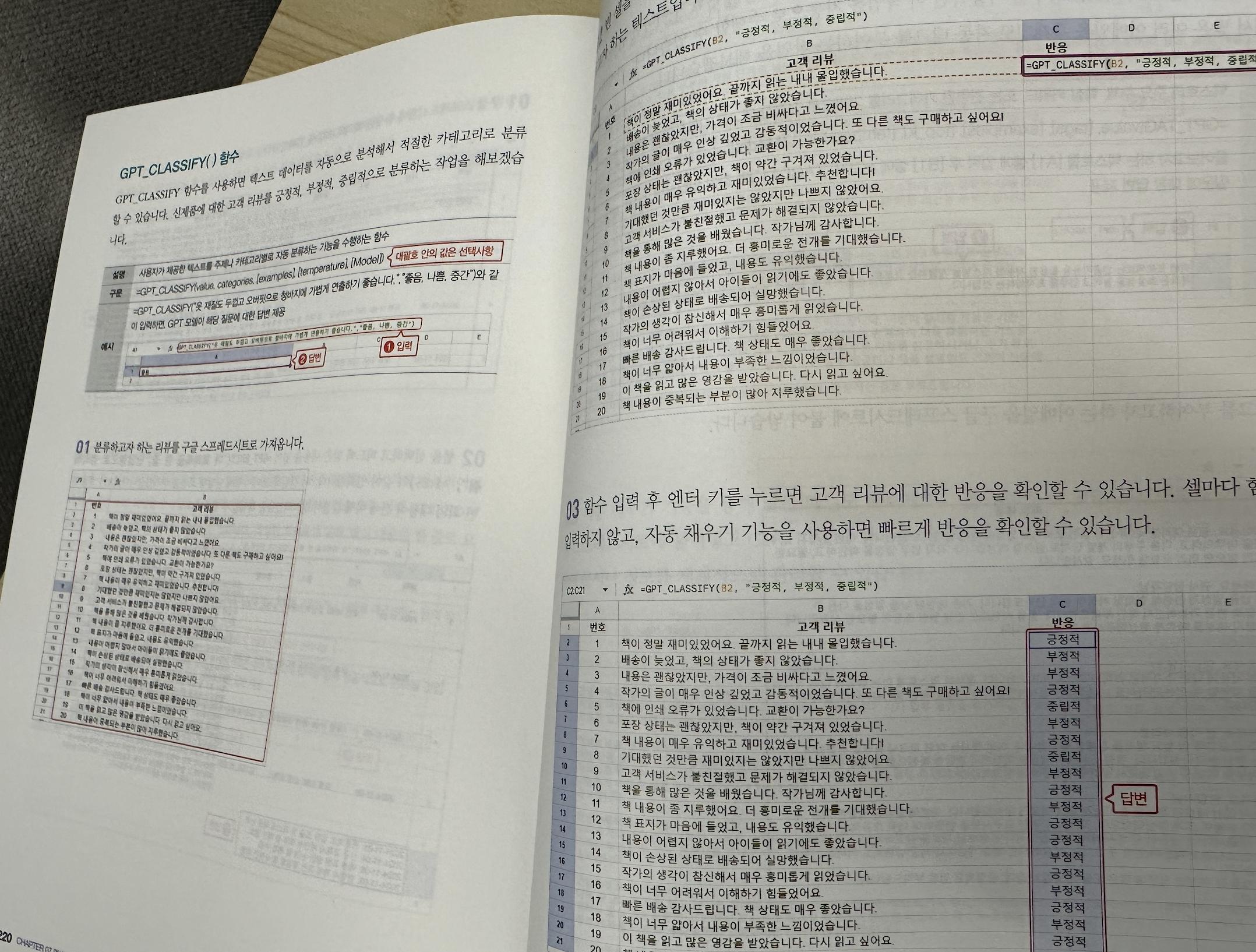 위의 방법을 통해 자료조사 시간을 단축시킬 수 있을 것이다. 책에는 훨씬 더 다양하고 효과적인 방법들이 소개되어 있다. 엑셀에서 챗 GPT API를 통해 함수를 사용할 수 있다는 것은 이 책에서 처음 알게 되었는데, GPT가 문구를 작성하고 사용자가 최종 수정만 하는 방식으로 사용할 수 있고, 데이터를 바로 표로 정리할 수 있으며, 날짜 형식을 통일되게 변환하거나, 도메인을 자동으로 추출하거나, 회의록을 한 줄로 각각 요약하거나, 리뷰를 분류하거나, 이메일에 주제별로 태그를 부여하는 등 여러가지 번거로운 일들을 자동으로 처리할 수 있어서 편리하다. 또한, GPT를 활용하여 생성한 챗봇을 외부서비스와 연동하는 과정도 소개되어 있어서, 업무에 활용한다면 큰 도움이 될 것이다 .