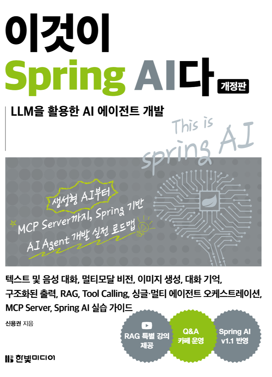 Spring AI 1.0 GA는 2025년 5월, Python LangChain이 시장을 빠르게 굳혀가던 시기에 약 2년간의 프리릴리즈를 거쳐 정식 출시됐다. 이 책은 텍스트 Spring AI의 주요 구성요소를 처음부터 끝까지 실습하는 입문서다.