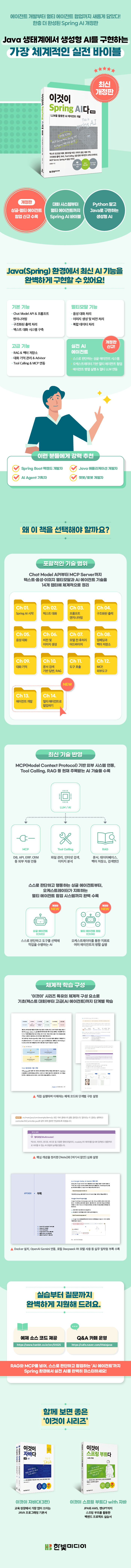 LLM애플리케이션을 개발하는데 필요한 기초 이론(프롬프트 엔지니어링, 임베딩, RAG, 도구 호출, MCP, 에이전트, 병렬처리, 스트리밍)과 스프링 프레임워크에서 AI를 지원하는 추상화 개념을 도표와 풍부한 예시로 자세히 설명한다. 스프링 개발 경험이 있다면 AI를 자세히 몰라도 적용하는데 어렵지 않을 것이다. 특히, 소스 코드에서 핵심 부분만 집중해서 친절하게 설명한다.