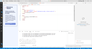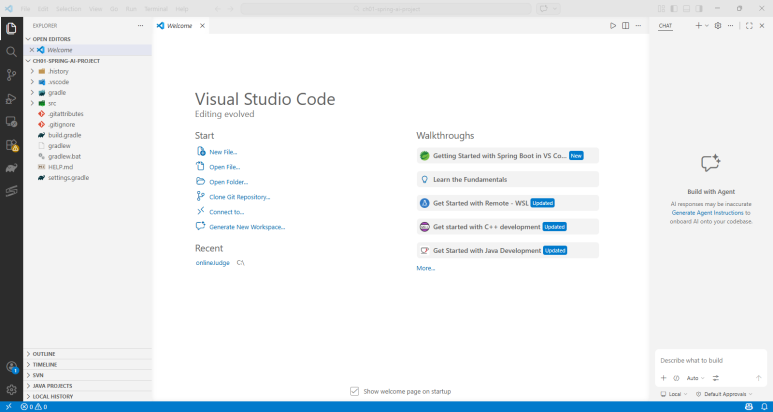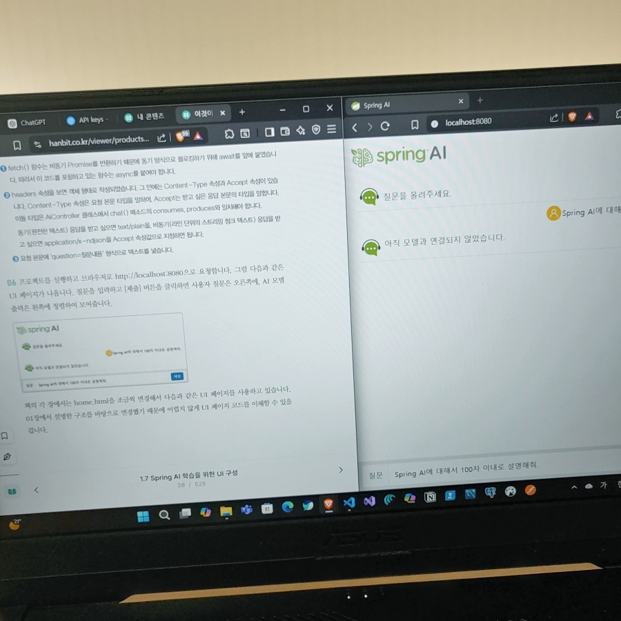 이미 구현된 구조를 타임리프로 구현해놓은 화면에서 주로 실습하게 되는데 굳이 따지자면 최신의 Spring 문법을 따라가고 있진 않아서 약간 고치고 싶은 (@Autowired라든가…) 부분이 있긴한데 오히려 레거시를 관리중에 Spring AI를 통해 챗봇이나 지식 기반 시스템을 만들어야하는 상황이라면 더 유리한 부분이 있겠다 싶었다. 실습 환경이 일단은 VSCode인 것도 보면 확실히 어느정도 만들던 사람들을 타겟팅한다는게 느껴졌다. (자바 환경변수, OpenJDK 등의 문제들을 가능한 피하기 위해서 요새는 초심자 대상이라면 IntelliJ를 선택하는 교재도 많은지라…)