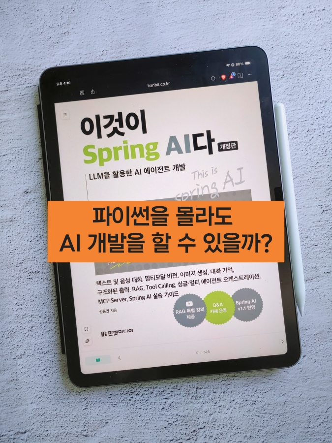 SpringCamp 2025에서 Spring AI 관련 발표를 듣고 관심이 생겨 서평 도서로 선택했습니다. 단순히 읽는 데 그치지 않고, 책의 내용을 토대로 직접 사이드 프로젝트를 하나 만들어본 뒤의 후기입니다.