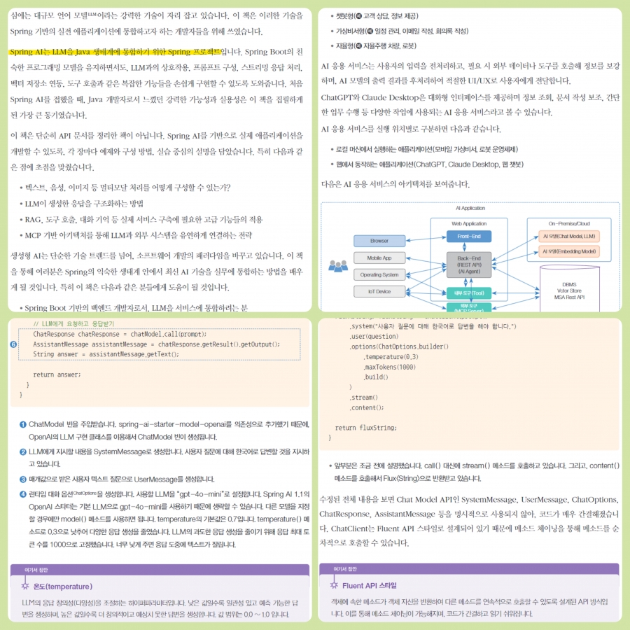 또한 덤으로 위의 책에서 Spring AI 사용 방법을 설명하기 위해서 기본적인 혹은 심화된 LLM 지식 설명도 같이 곁들여져 있기 때문에 (System, User, Assistant Message 등등) LLM의 배경을 어느 정도 모르고 있어도, 책의 커리큘럼을 따라가다 보면 자연스레 학습할 수 있다.