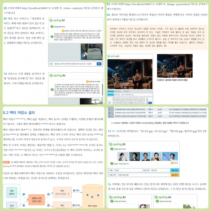 이 책의 가장 큰 특징은 Spring 개발자 관점에서 AI를 설명한다는 점입니다. Python 중심의 AI 환경에 익숙하지 않은 개발자도, 기존에 사용하던 Spring 구조 안에서 AI 기능을 이해하고 적용할 수 있도록 구성되어 있습니다. 실습 예제도 단순히 따라 해보는 수준이 아니라 실제 서비스로 확장할 수 있는 형태로 구성되어 있어 활용도가 높습니다. 프롬프트를 어떻게 구성할지, 벡터 검색을 어떻게 적용할지, 그리고 AI 응답을 서비스 로직에 어떻게 연결할지까지 흐름이 자연스럽게 이어집니다. 덕분에 단순 구현을 넘어 AI를 서비스 기능으로 설계하는 관점까지 익힐 수 있습니다.