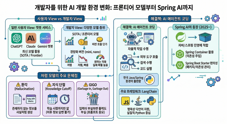 이런 것들을 최소화하기 위해 LLM에 이것저것 프로그래밍적 술수(?)를 쓰게 되는데 이런 걸 AI 에이전트 코딩이라고 한다. 에이전트 코딩이란 LLM이 단순히 텍스트를 생성하는 것을 넘어서, 외부 도구를 호출하고, 검색을 수행하고, 코드를 실행하는 등 자율적으로 작업을 수행하도록 프로그래밍하는 것을 말한다. 가장 유명하면서 여러 플랫폼/언어에서 쓰이고 있는 LangChain 프레임워크다. 그런데 이게 명목상으로는 JS/Java/Python을 지원하지만 실질적으로는 Python 중심이다 보니 이제 자바/스프링 공화국인 한국에서는 외부 모듈이나 api 서버로 구현하지 않는 한 조금 뭔가 머시기 했던게 사실이다. 그러다 작년(2025년) 즈음해서 Spring AI가 릴리즈 되었고, ChatModel/ChatClient 등을 활용해서 기존에 스프링 컨테이너를 활용한 의존성 주입 및 스프링 부트의 스타터를 통한 편한 패키지/의존성 관리가 가능해졌다.