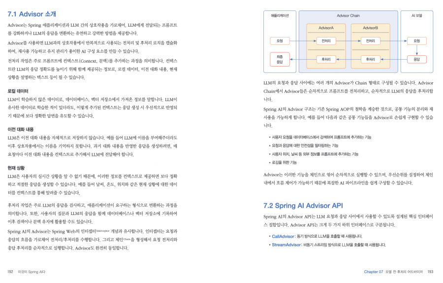 Chapter 07 모델 전·후처리 어드바이저 7.1 Advisor 소개 7.2 Spring AI Advisor API 7.3 Advisor 구현 7.4 Advisor 적용 7.5 공유 데이터 이용 7.6 내장 Advisor 7.7 로깅 Advisor 7.8 세이프가드 Advisor