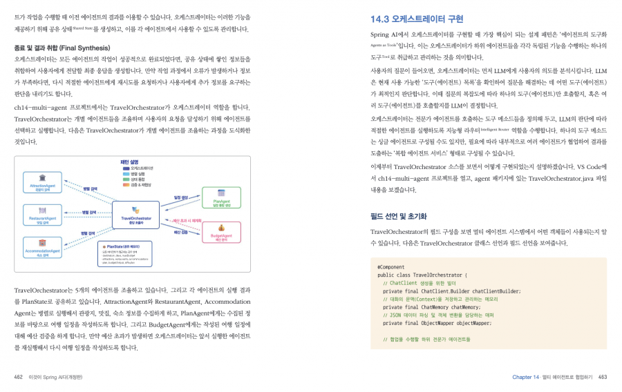 내용 자체가 LangChain에서 볼 수 있던 접근법과 상당히 유사하긴 하였으나 어쨌든 자바는 자바고, 스프링은 스프링이라서 그 특색을 따라가는 것이 있는데 거기까지 하나하나 설명하기엔 너무나 방대하고 전문적 영역인지라 과감히 예제 코드 중심으로 '작동 원리'를 위주로 설명한 것이 좋았다.