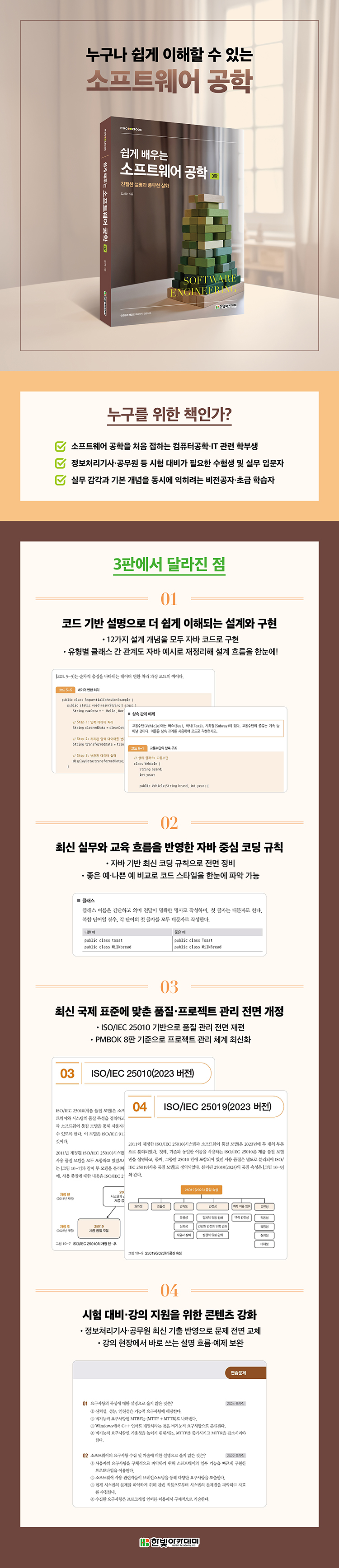 특히 자바 코드 예시로 설계 원리를 직관적으로 학습할 수 있도록 했으며, PMBOK 8판과 ISO/IEC 25010 품질 모델 등 최신 기준을 담아 실제 현장에서의 이해도를 높였습니다.