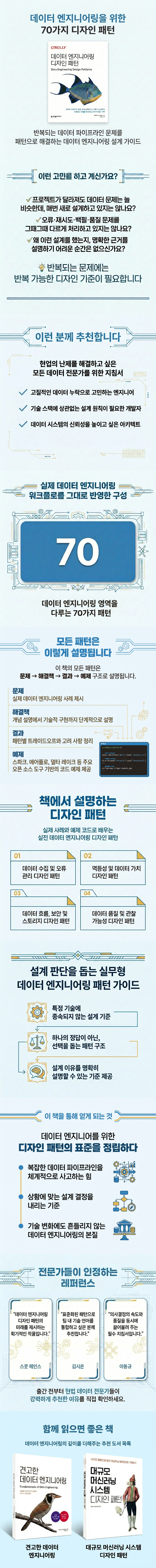 이 책은 소프트웨어 엔지니어링 분야에서 검증된 디자인 패턴 개념을 데이터 엔지니어링으로 확장해, 이 영역에서 디자인 패턴이 무엇을 의미하는지부터 차근차근 설명합니다.