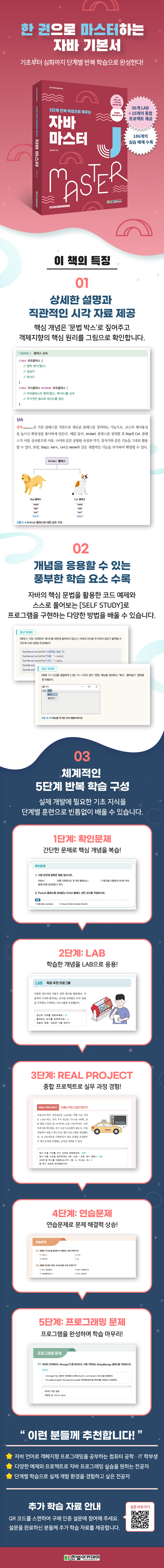 『자바 마스터』는 자바 언어로 객체지향 프로그래밍을 시작하는 독자를 대상으로 합니다. 자바의 기초 문법과 객체지향 언어의 핵심 개념을 도식을 사용해 상세히 설명하며, 이를 활용할 수 있는 다양한 실습 예제를 수록했습니다. 더 나아가 실제 개발에 필요한 실무 능력을 쌓을 수 있도록 5단계의 반복 학습 과정을 제공합니다. 이 책의 단계별 훈련으로 현실 세계의 문제를 코드로 구현하는 능력을 키우고 자바를 마스터해 보세요.