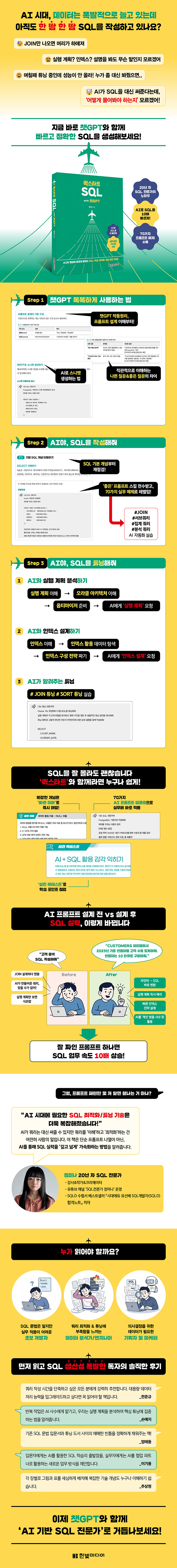 20년 차 SQL 전문가가 알려주는 AI를 나만의 SQL 사수로 만드는 법. 이 책은 단순한 문법 학습서가 아닌 SQL과 생성형 AI를 접목해 업무 생산성을 극대화하는 방법을 제시하는 가이드이다.