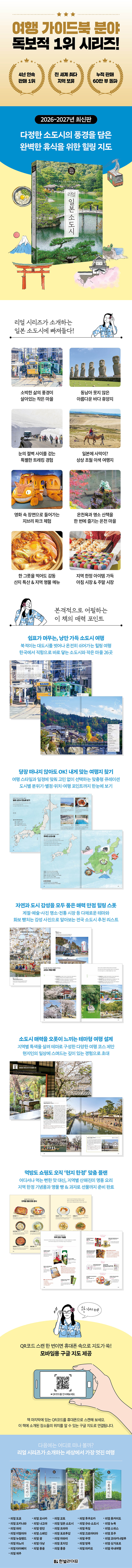 저자가 수년간 직접 발로 뛰며 쌓아 올린 깊이 있는 정보는 현지인의 삶 속으로 스며들듯 소도시의 진면목을 볼 수 있도록 돕는다. 책 앞머리에서 전체 여행지를 둘러보고, 도시별로 지역 특색을 살린 테마 여행 정보를 통해 보다 자세히 살펴볼 수 있다. 화보같이 아름다운 사진과 일러스트로 구성된 책장을 넘기다 보면 여행의 풍경이 머릿속에 그려지고, 없던 여행 욕구도 마구 치솟는 마법을 경험하게 된다. 다음 일본 여행은 <리얼 일본 소도시>와 함께 한적한 작은 마을에서, 오랜 여운이 남는 감성 가득한 경험을 해 보면 어떨까.